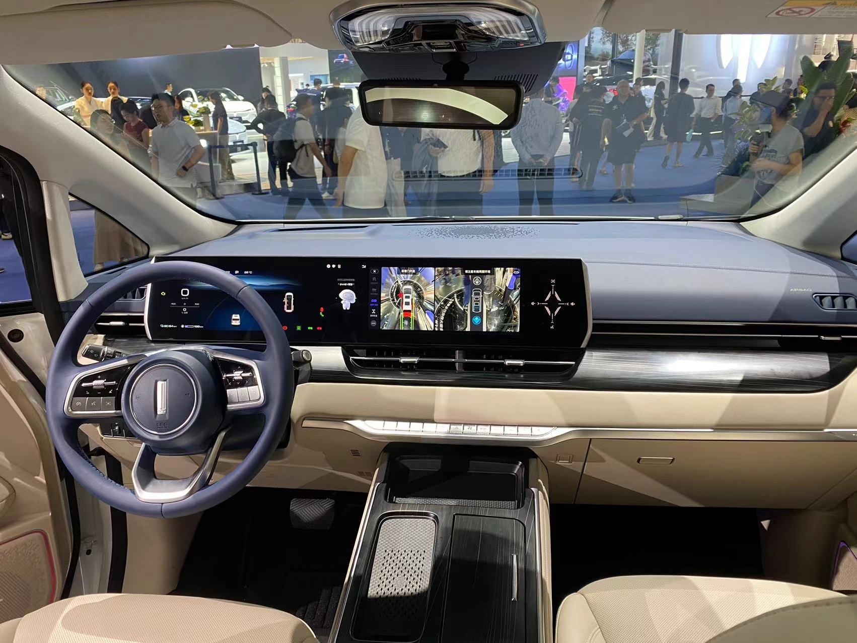 進(jìn)入車內(nèi),最引人矚目的便是由三塊12.3英寸屏組成的聯(lián)屏系統(tǒng),并內(nèi)置高通驍龍8155芯片斑馬智行系統(tǒng)。主副駕車門上還配備了電子后視鏡(選裝件)的車內(nèi)顯示屏,座艙的科技感濃重。整個(gè)內(nèi)飾風(fēng)格素雅簡約,中控臺和中央通道區(qū)域使用了大面積皮質(zhì)包覆,質(zhì)感豪華。
