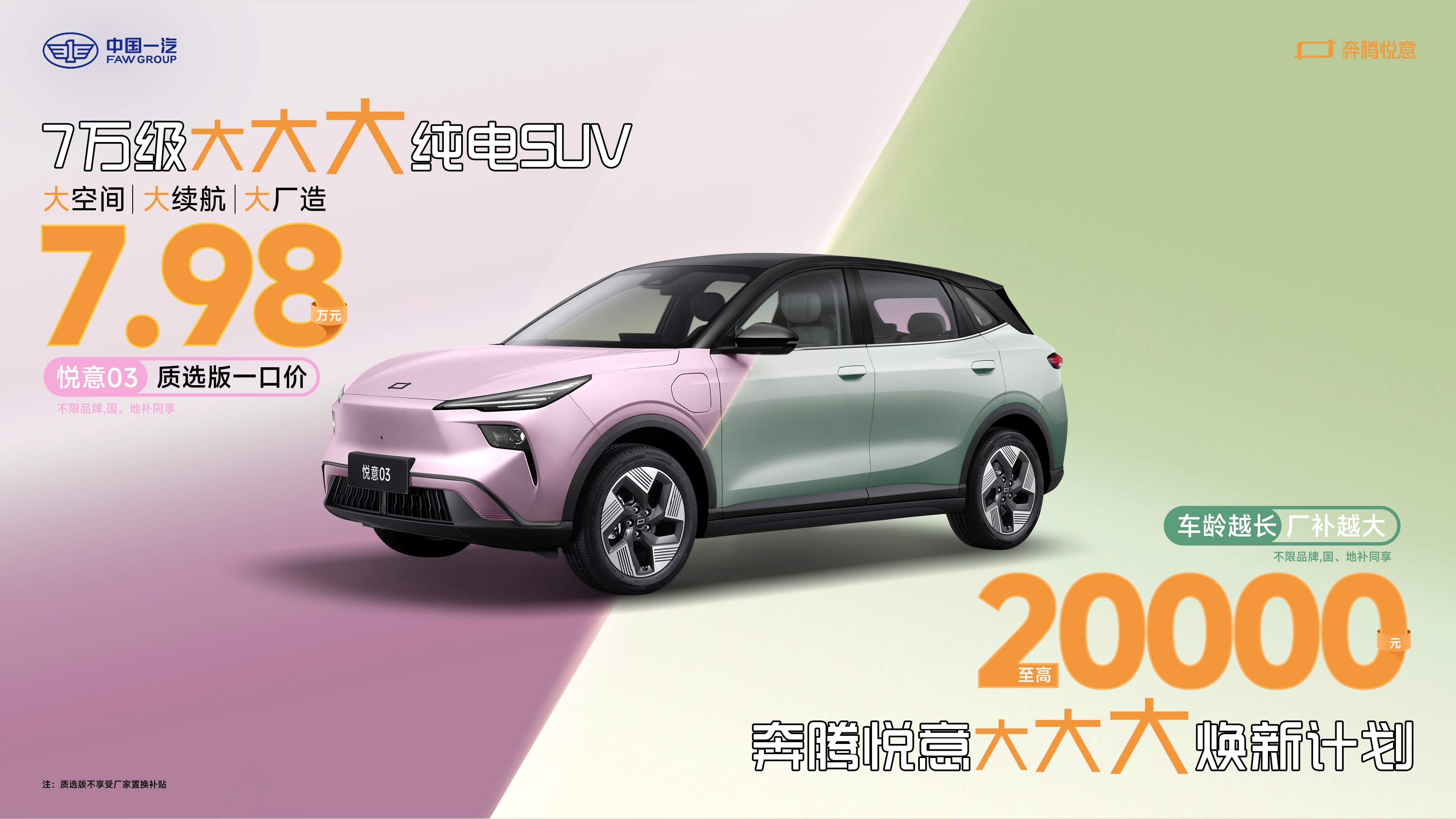 令人驚喜的是,剛剛上市的悅意03,即日起重磅加推全新版型“質(zhì)選版”,一口價(jià)僅售7.98萬元,原有車型的煥新廠補(bǔ)還將拉高至最高20000元,同時(shí)還可同享國、地補(bǔ),堪稱A級SUV質(zhì)價(jià)比新卷王。再加持大空間、大續(xù)航和大廠造三大越級亮點(diǎn),悅意03這一“7萬級大大大純電SUV”,必將成為奔騰悅意展臺的又一亮點(diǎn)。