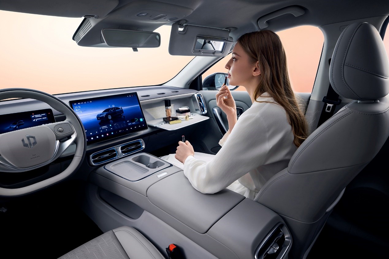 零跑B01沿用了B系列首創(chuàng)的"百變副駕空間"設計——通過6個魔術拓展孔與1個矩形凹槽,可自由組合折疊桌板、手機支架、儲物盒、水杯架、掛飾等配件,適配辦公、娛樂、收納等多場景需求。