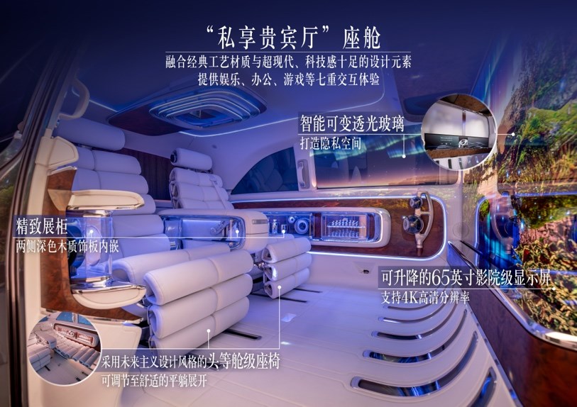 Vision V概念車開啟個性化數(shù)字豪華的全新維度。帶分屏功能的65英寸影院級顯示屏可自如升降,以4K超清畫質(zhì)呈現(xiàn)震撼視覺效果。7臺投影儀集成于車頂及地板,側(cè)窗更化身為輔助“屏幕”,構(gòu)建360度全景體驗。帶杜比全景聲的環(huán)繞立體聲音響系統(tǒng)配備42個揚聲器,包含座椅內(nèi)的振蕩器。如繭房般全方位環(huán)繞感官的數(shù)字體驗,為乘客構(gòu)建七重交互體驗世界——娛樂、放松、游戲、辦公、購物、探索及卡拉OK,讓座艙可化身為“移動影院”、“移動電競艙”、“移動音樂廳”、“移動辦公室”或放松身心的“移動綠洲”。
