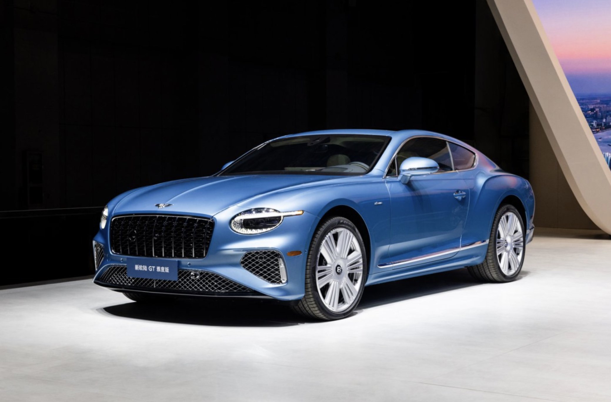 豐富配置包括健康座椅(Wellness seating)、天然啞光直紋胡桃木飾面、雅度版內(nèi)飾照明式迎賓踏板以及真皮飾面上的反襯色縫線。此外,旅行(Touring)配置、舒適(Comfort)配置和氛圍燈套件(Lighting Specification)也均為標(biāo)配。展臺(tái)上采用淺溫莎藍(lán)(Light Windsor Blue)外觀漆色的新歐陸GT雅度版配備了全景天窗,而新歐陸GT敞篷雅度版則配備了頸部加熱裝置,以便在較冷天氣下享受舒適的敞篷駕駛。