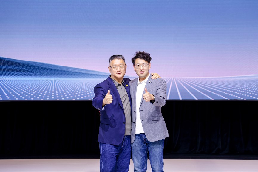 上汽集團總裁賈健旭(左)與火山引擎汽車總經理楊立偉(右)合影