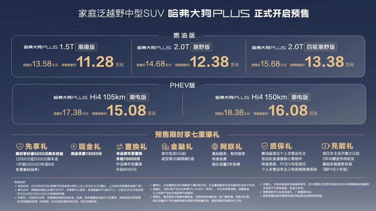 作為哈弗展臺的重磅“c位”產(chǎn)品,“為家而來”的哈弗大狗PLUS正式發(fā)布預(yù)售,現(xiàn)在下訂可享受13000元現(xiàn)金優(yōu)惠,至高10000元置換補貼,預(yù)售換新價格11.28萬元至16.08萬元。其中,哈弗大狗PLUS:1.5T潮趣版11.28萬元、2.0T潮野版12.38萬元、2.0T四驅(qū)潮野版13.38萬元。哈弗大狗PLUS PHEV : Hi4 105km潮電版15.08萬元、Hi4 150km 潮電版16.08萬元。此外,更有先享禮、金融禮、網(wǎng)聯(lián)禮、質(zhì)保禮、充能禮可享,包括: