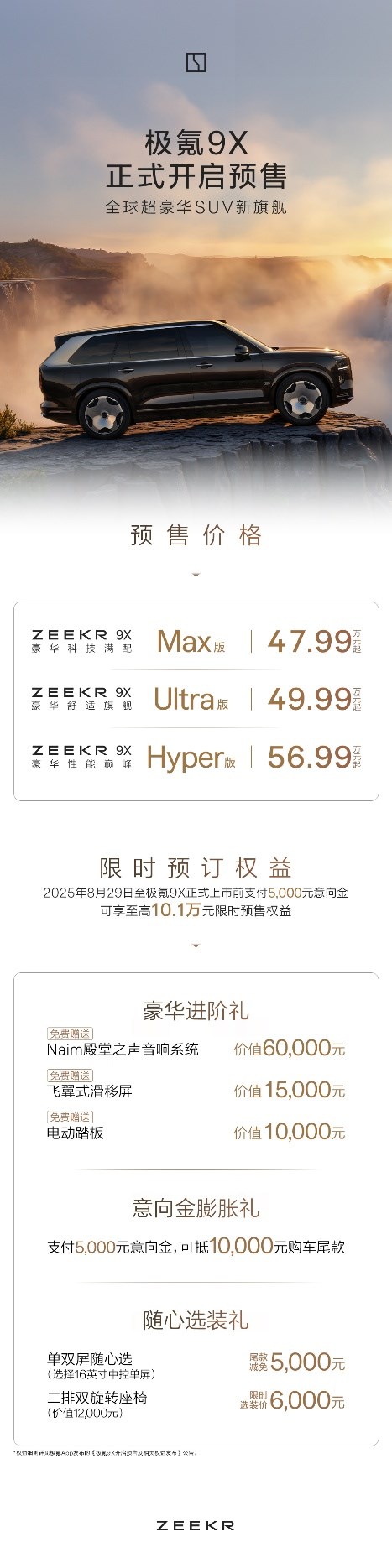 2025成都國(guó)際車展開幕首日,全球超豪華SUV新旗艦——極氪9X正式開啟預(yù)售,共推出Max版、Ultra版、Hyper版三個(gè)版型,預(yù)售價(jià)格分別為47.99萬(wàn)元起、49.99萬(wàn)元起、56.99萬(wàn)元起。即日起,用戶可通過(guò)極氪App、極氪官網(wǎng)、極氪小程序、全國(guó)各大城市的極氪門店等官方渠道進(jìn)行預(yù)定。
