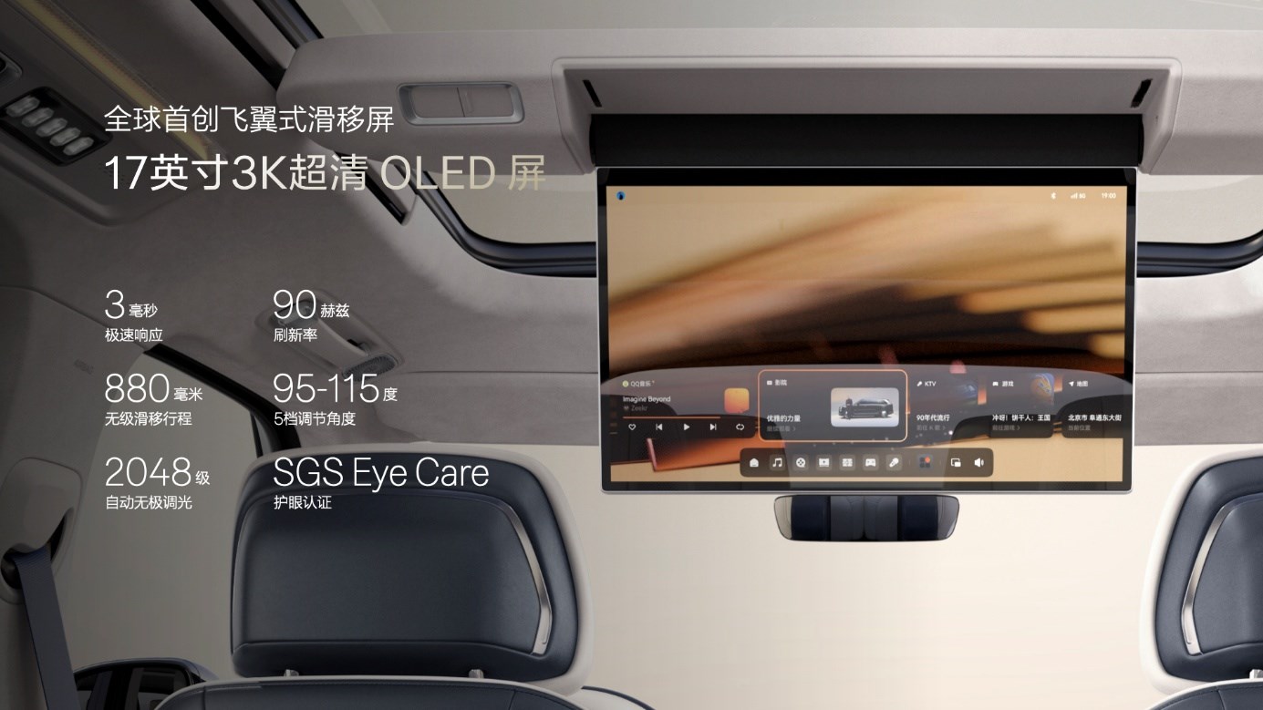 極氪9X還搭載全球首創(chuàng)的17英寸3K超清OLED飛翼式滑移屏,徹底解決后排吸頂屏與天窗開啟的沖突。通過(guò)車頂高強(qiáng)度滑軌結(jié)構(gòu),飛翼式滑移屏可實(shí)現(xiàn)88厘米無(wú)極滑移與5檔角度調(diào)節(jié),無(wú)論乘客落座哪一排、以何種坐姿,屏幕都能“飛”至面前,隨時(shí)呈現(xiàn)大千世界的無(wú)限精彩,用遠(yuǎn)見讓掌控千里視野成為現(xiàn)實(shí)。