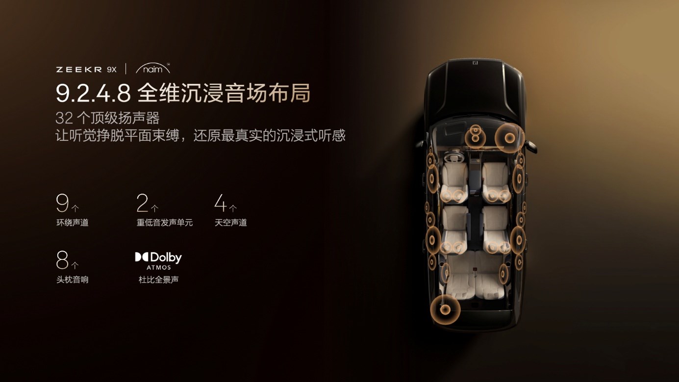 極氪9X每個(gè)座位都是黃金聽位。全車共配備32個(gè)頂級(jí)揚(yáng)聲器,定制支持杜比全景聲的9.2.4.8全維沉浸音場(chǎng)布局,為用戶打造全場(chǎng)景沉浸式立體聲,還原最極致的豪華聲場(chǎng)。揚(yáng)聲器的材質(zhì)選料考究,高頻采用Naim專利「M型」鈦膜,實(shí)現(xiàn)“高音甜、中音準(zhǔn)、低音沉”的通透音質(zhì),配合Naim獨(dú)立四音區(qū)技術(shù),無(wú)論坐在車內(nèi)的哪個(gè)位置,始終確保用戶能夠感受到最純粹的天籟之聲。