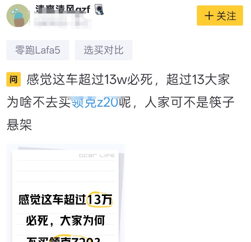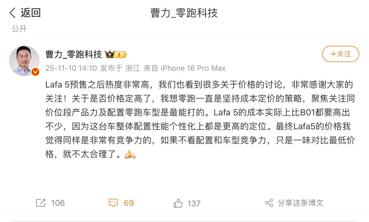 對(duì)此,曹力也在個(gè)人社交平臺(tái)表示,“關(guān)于是否價(jià)格定高了,我想零跑一直是堅(jiān)持成本定價(jià)的策略,聚焦關(guān)注同價(jià)位段產(chǎn)品力及配置零跑車(chē)型是最能打的。Lafa 5的成本實(shí)際上比B01都要高出不少,因?yàn)檫@臺(tái)車(chē)整體配置性能個(gè)性化上都是更高的定位。最終Lafa5的價(jià)格我覺(jué)得同樣是非常有競(jìng)爭(zhēng)力的,如果不看配置和車(chē)型競(jìng)爭(zhēng)力,只是一味對(duì)比最低價(jià)格,就不太合理了。”